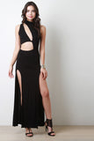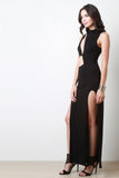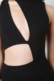 This alluring maxi dress features soft jersey knit, mock neck, bodice cut outs, and deep side slits. Accessories sold separately. Made in U.S.A. 95% Rayon, 5% Spandex.