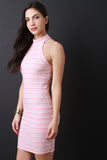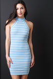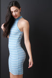 This ribbed knit dress features horizontal stripes, sleeveless cutaway design with a mock neckline, and sculpture fit. Accessories sold separately. Made in U.S.A. 65% Polyester, 32% Rayon, 3% Spandex.