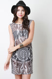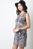 This semi-sheer tribal print fabrication, round neckline, sleeveless design, loose fit, and straight hem. Accessories sold separately. Made in U.S.A. 100% Polyester.