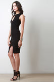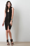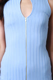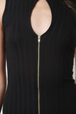 This midi dress features a sleeveless design, keyhole opening, exposed front zipper detail, center front slit, and soft rib knit fabrication. Accessories sold separately. Made in U.S.A. 95% Rayon, 5% Spandex.