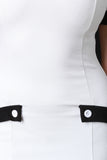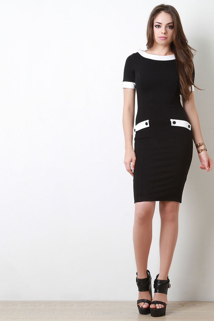 This mod dress has a contrast trim, short sleeve. scoop neckline, princess seam details, faux pockets, back vent, center back zipper closure, knee length hemline and a knit fabrication. Accessories sold separately. Made in U.S.A. 33% Nylon, 62% Viscose, 5% Spandex.