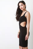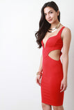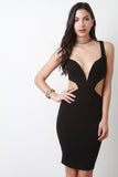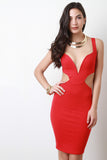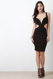 This bold dress features a wired plunging v-neckline, thick shoulder straps, sleeveless, and side cutout design. Finished with a midi-length hemline and exposed rear zip-up closure. Accessories sold separately. Made in U.S.A. 67% Viscose, 28% Nylon, 5% Spandex.