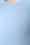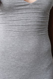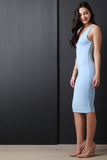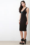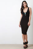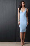 This casual dress features a textured jersey knit fabrication, deep v-neckline, scoop back, and sleeveless construction. Finished with a midi-length hemline. Accessories sold separately. Made in U.S.A. 95% Polyester, 5% Spandex.