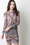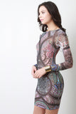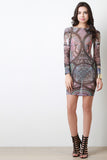 This eye-catching dress features a semi-sheer mesh fabrication with colorful tribal print, round neckline, long sleeves, and finished with a midi-length hemline. Accessories sold separately. Made in U.S.A. 95% Polyester, 5% Spandex.