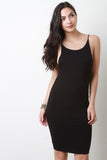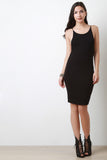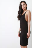 This casual dress features a jersey knit fabrication, scoop neckline, open back silhouette, thin shoulder straps, and finished with a midi-length hemline. Accessories sold separately. Made in U.S.A. 95% Polyester, 5% Spandex.