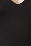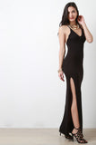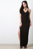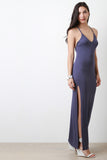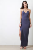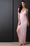 This simple dress features a jersey knit fabrication, deep v-neckline, spaghetti straps crisscrossing at back, and a high slit on the side. Finished with a maxi-length hemline. Accessories sold separately. Made in U.S.A. 95% Polyester, 5% Spandex.