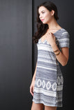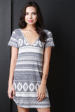 This casual dress features a multi colored tribal inspired stripe pattern, rib knit fabrication, deep V-neckline, deep V back, A-line cut and a tie closure at the nape. Accessories sold separately. Made in U.S.A. 51% Rayon, 44% Polyester, 5% Spandex.