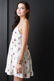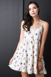 This open back design, gathered tiered details, scoop neckline with bias tape finish, spaghetti straps and a light weight woven fabrication. Accessories sold separately. Made in U.S.A. 100% Polyester.