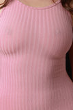 This bodycon midi dress features a scooped neckline, spaghetti shoulder straps, backless design with horizontal strap, stretchy sculpture silhouette, and ribbed knit fabrication. Accessories sold separately. Made in U.S.A. 62% Polyester, 34% Rayon, 4% Spandex.