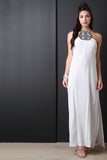 This sleeveless maxi dress features a halter neckline with beaded embroidery design, concealed back-zip closure, and left vent slit. Accessories sold separately. 100% Rayon.
