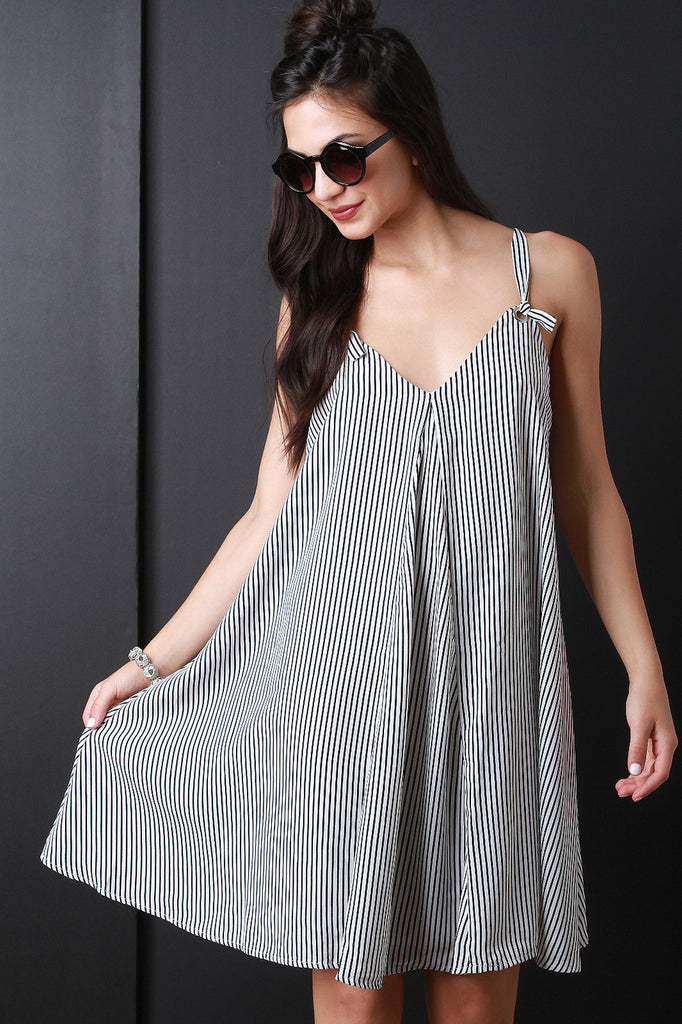 This swingy stripe detail throughout, v-neckline, sleeveless design, and shift silhouette. Finished with an adjustable knotted shoulder straps. Fully lined. Accessories sold separately. Shell: 100% Polyester. Lining: 100% Polyester.