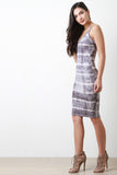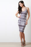 This tie dye fabrication, spaghetti straps, scoop neckline, with a midi length hem. Accessories sold separately. Made in U.S.A. 44% Polyester, 29% Cotton 27% Rayon.
