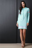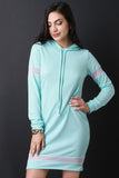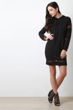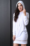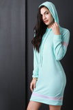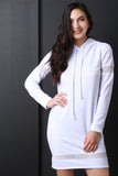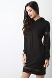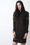 This pull-over sweater dress features a drawstring hoodie, long sleeves, and semi-sheer mesh panel accent. Accessories sold separately. Made in U.S.A. 87% Polyester, 9% Rayon, 4% Spandex.