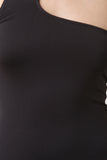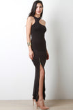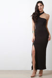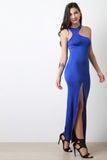 This maxi dress features a stretchy sculpture silhouette fit, asymmetrical cutaway neckline and racer back with double button secure closure, finished with a high zipper slit construction at right side. Accessories sold separately. Made in U.S.A. 92 % Polyester, 8% Spandex.