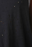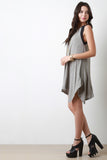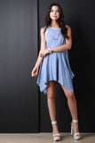 This dress features a marled knit fabrication, color block design, bullet hole details throughout, sleeveless fit, and scoop neckline. Finished with a handkerchief hemline. Accessories sold separately. Made in U.S.A. 100% Cotton.