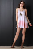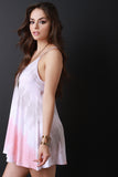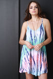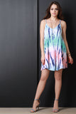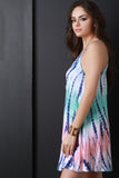 This dress features a tie dye print on a jersey knit fabrication, spaghetti straps to a crisscross back detail, deep v-neckline, and mini-length hemline. Accessories sold separately. Made in U.S.A. 96% Rayon, 4% Spandex.