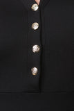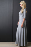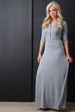 This maxi dress features a jersey knit fabrication, v-neckline, button up design with gold buttons accent, faux two front buttoned pockets, and elbow length sleeves. Accessories sold separately. Made in U.S.A. 87% Polyester, 10% Rayon, 3% Spandex.