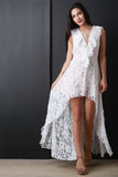 This maxi dress features a semi-sheer floral lace fabrication, v-corset neckline with ruffle collar, sleeveless, high waisted cinched seam, flowy high low hemline, nude underlay, and a hidden zipper fastener at left side. Accessories sold separately. 100% Nylon. Lining: 100% Polyester.