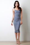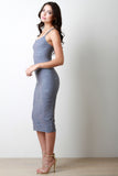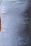 This casual dress features a jersey knit fabrication with distressed design throughout, scoop neckline, spaghetti straps to a crisscross back, and midi length hemline. Accessories sold separately. Made in U.S.A. 52% Polyester, 38% Cotton, 10% Rayon.