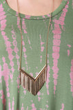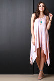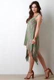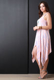 This dress features a jersey knit fabrication, tie dye print pattern, scoop neckline, sleeveless fit, and handkerchief hemline. Accessories sold separately. Made in U.S.A. 95% Rayon, 5% Spandex.