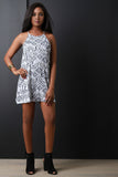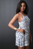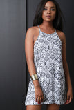 This  mini dress  features abstract pattern print, halter neckline, and relaxed fit. Accessories sold separately. Made in U.S.A. 95% Rayon, 5% Spandex.