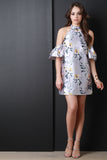 This retro inspired dress features a mock neckline, floral print satin fabrication, cold shoulder cut out, ruffle sleeve, with a loose shift dress fit. Accessories sold separately. 100% Polyester.