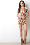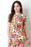 This French Terry shirt dress features a vibrant floral print, mock neckline, short sleeves fit, and slight high low rounded hemline. Accessories sold separately. Made in U.S.A. 48% Rayon, 48% Polyester, 4% Spandex.