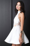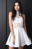 This chic dress features a crochet lace top design, halter neckline with two button hook closure at nape, open back, and ruffled skirt with banded hemline. Accessories sold separately. Made in U.S.A.