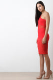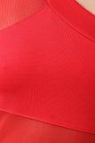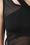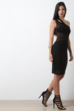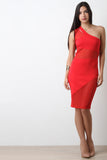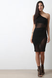 This dress features a one shoulder design with cutout detail, stretchy knit fabrication with mesh panels, back cutouts, and midi dress cut hem. Accessories sold separately. Made in U.S.A. 68% Cotton, 27% Polyester, 5% Elastane.