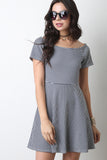 This stripe print throughout, short sleeves design, and flowy skirt. Accessories sold separately. 60% Polyester, 35% Rayon, 5% Spandex.
