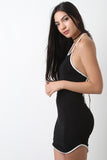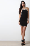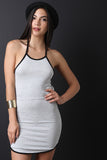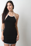 This mini dress features soft jersey knit, contrast color trim, halter neck, sleeveless design, open back, and self-tie straps. Accessories sold separately. Made in U.S.A. 48% Rayon, 48% Rayon, 4% Spandex.