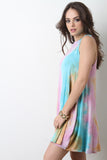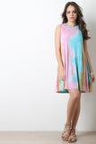 This jersey knit dress features a crew neckline, sleeveless, tie-dye, and trapeze cut fit. Accessories sold separately. 95% Rayon, 5% Spandex.
