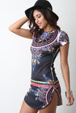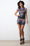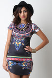 This dress features a smooth stretchy knit fabrication with abstract spherical prints, cap sleeves, and round neckline. Finished with a rounded mini-length hemline. Accessories sold separately. Made in U.S.A. 96% Polyester, 4% Spandex.