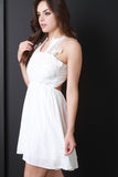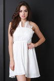 This lovely skater dress features a crochet lace collar piece, cross back gathered straps, open back, elastic waist, and a full gathered skirt with a full lining. Accessories sold separately. Self: 55% Rayon, 45% Viscose. Lining 96% Polyester, 4% Spandex.