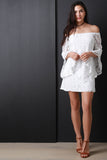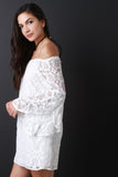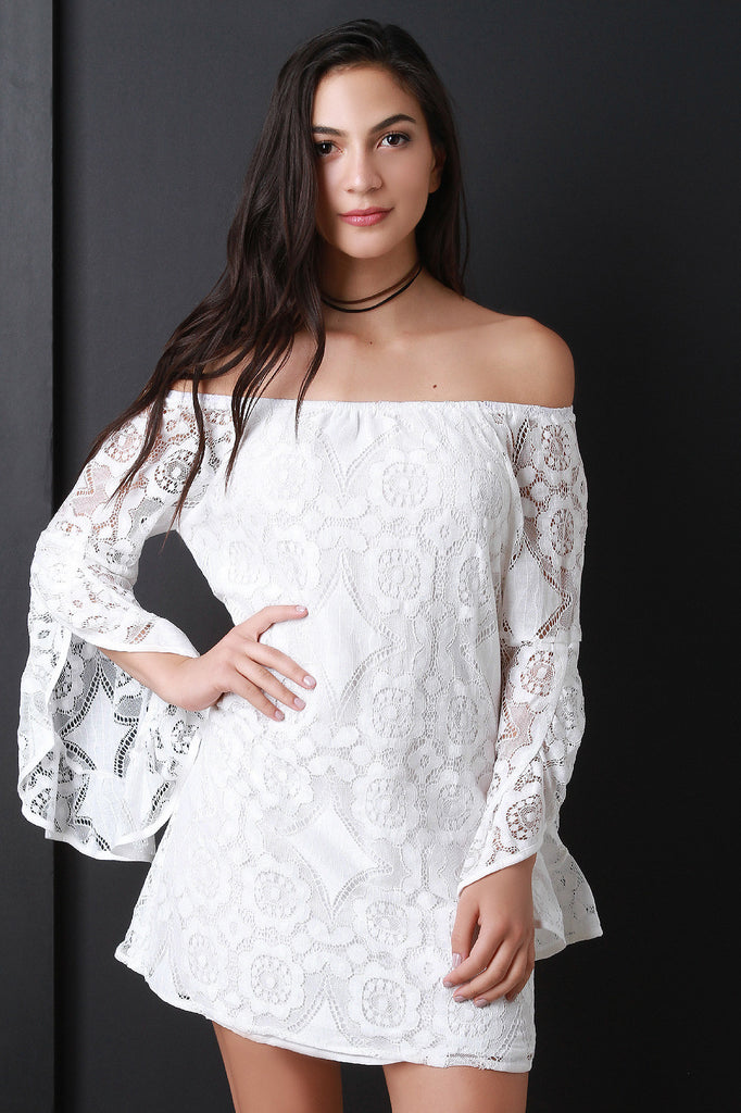 This chic shift dress features an elastic off the shoulder neckline, lace fabrication, long tulip sleeves, loose fit, fully lined and a mini hemline. Accessories sold separately. Shell: 100% Polyester Lining: 100% Rayon.
