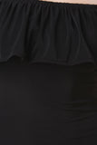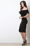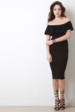 This charming dress features a smooth stretchy fabric, elasticized off-the-shoulder ruffled neckline, and midi-length hem. Accessories sold separately. Made in USA. 94% Polyester, 6% Spandex.
