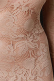This dress features a semi-sheer lace fabrication, mock neckline, long sleeves, cinched high waisted seam, left vent slit, and a hidden zipper fastener at back. Accessories sold separately. 90% Nylon, 10% Spandex.
