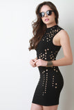 This sleeveless bodycon dress features a mock neckline, sculpture fit, hidden zipper fastener at back, and gold-tone eyelet d�cor throughout. Accessories sold separately. 63% Rayon, 32% Polyester, 5% Spandex.