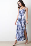 This maxi dress features streak tie dye print, scoop neckline, spaghetti straps, and two side slits. Accessories sold separately. Made in USA. 96% Polyester, 4% Spandex.