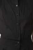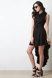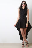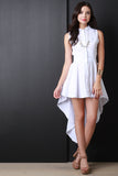 This chic dress features a woven fabrication, high collared neckline, button up front closure, skater dress silhouette, high low hemline and a self tie back. Accessories sold separately. Made in U.S.A. 92% Cotton, 8% Spandex.