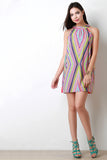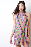 This shift dress features a self tie mock neckline, gather detail, sleeveless design, woven fabrication, bright geometric tribal print pattern, and a mini length hemline. Accessories sold separately. Made in U.S.A. 100% Polyester.