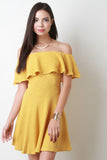 This strapless dress features a thermal knit fabrication, off the shoulder elastic neckline, large single ruffle detail, fitted bodice and a full circle skirt. Accessories sold separately. Made in U.S.A. 94% Cotton, 6% Spandex.