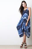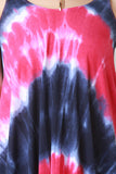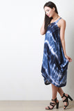 This casual dress features a soft knit fabrication, tie dye coloring scoop neckline, racerback cut, loose flowing fit, trapezoid silhouette, and a curved midi hemline. Accessories sold separately.Made in U.S.A. 96% Rayon, 4% Spandex.