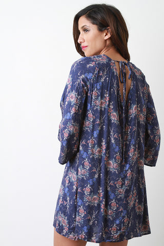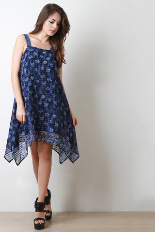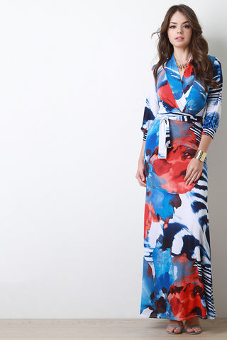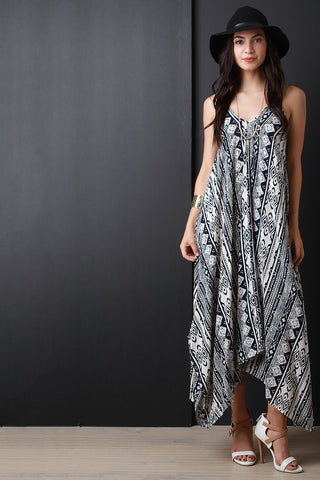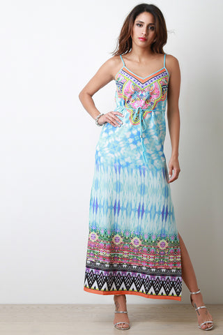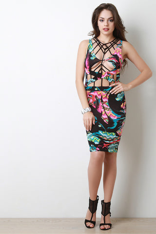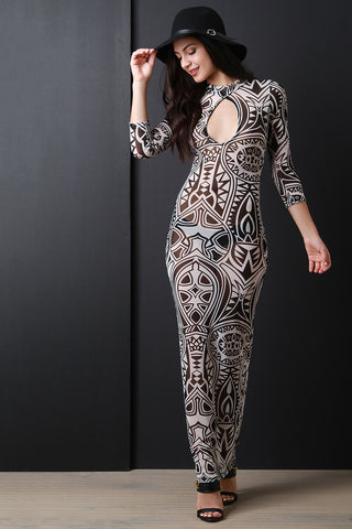 Tribal Contrast Mesh Panel Mock Neck Midi Dress