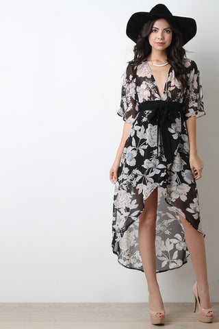 Floral Print Chiffon Open Back Wrap Dress