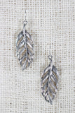 These dangle earrings feature a metal feather shaped charm, and finished with french hook backs.