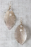 These detail-oriented earrings feature a polished metal finish, textured leaf design, matching dangling rhinestones. and a french hook back.