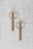 These modern earrings feature a brushed metal finish, open circle charm with pieces of chain dangling from the top, finished with french hook backs.