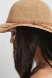 This summer hat is floppy hat silhouette with a straw design. Features a decor braided bow tie string. Finished with an interior ribbon lining.
