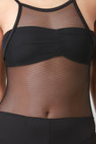 This jumpsuit features a semi-sheer mesh upper half, spaghetti shoulder straps, backless, contrasting cinched seam, and tight legging pants. Accessories sold separately. Made in U.S.A. 90% Polyester, 10% Spandex.